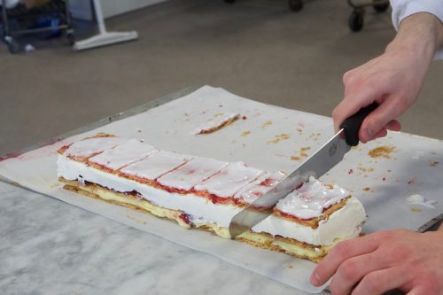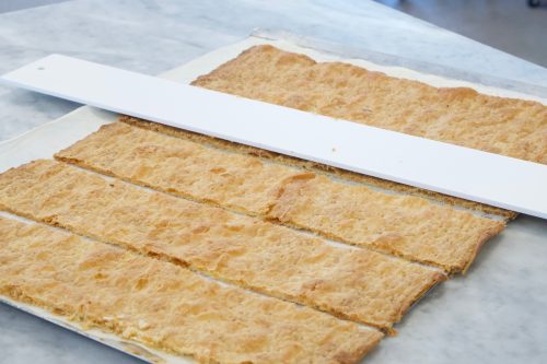 - Dela den avbokade smördegsplattan i längder lika breda som linjalen.