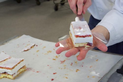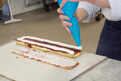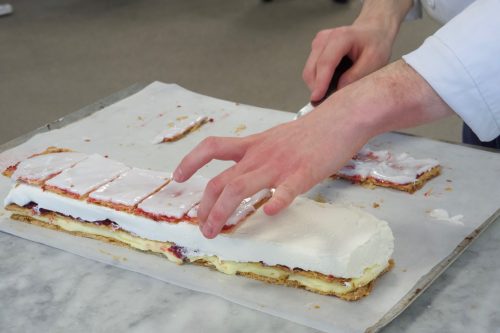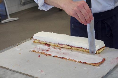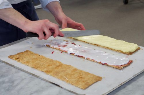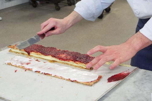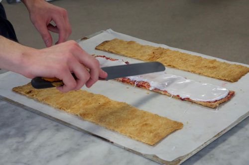 2. Förbered locken till bakelserna: bred ut hallonsylt på en av längderna- skrapa så att du har så tunt som möjligt av sylten.