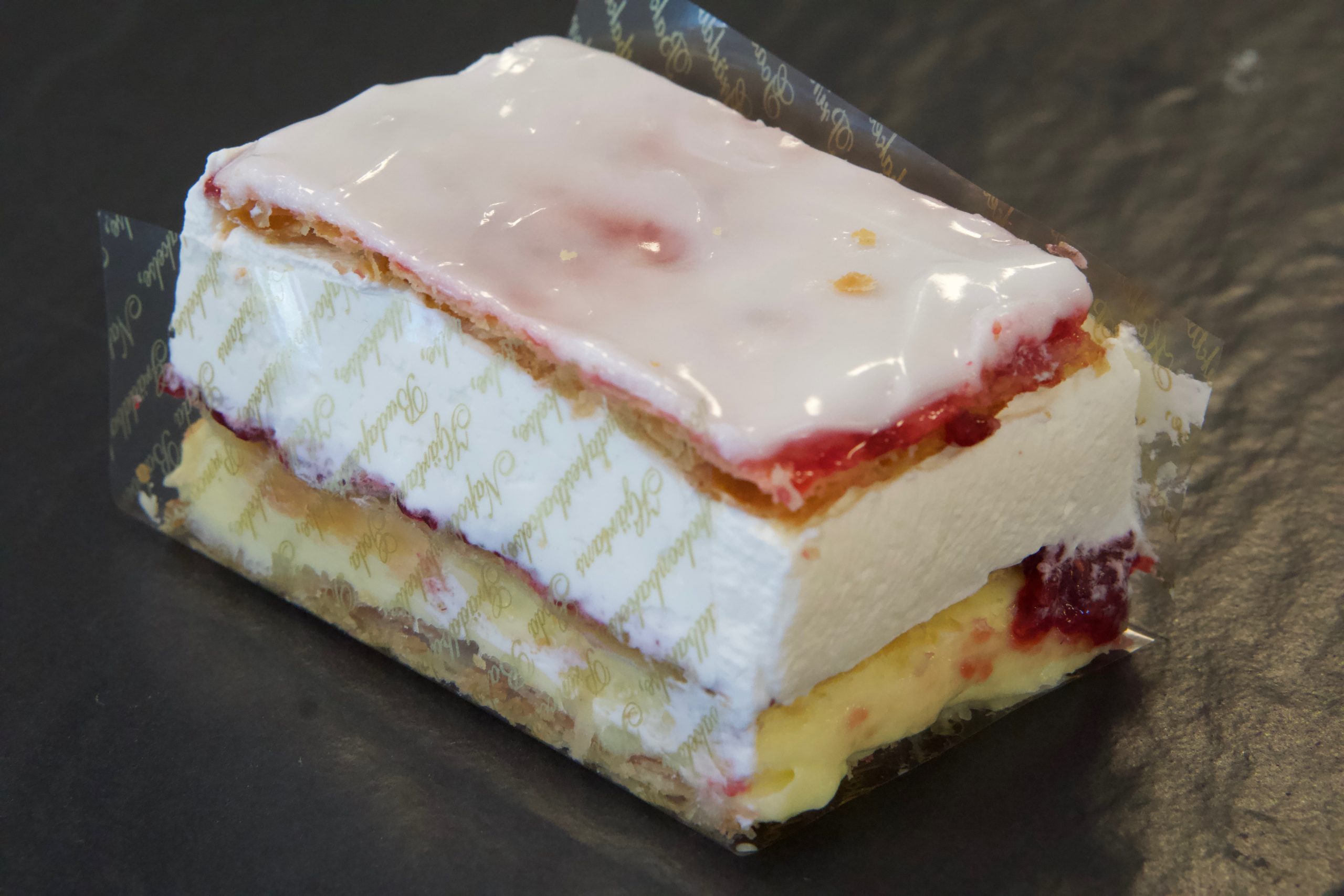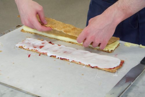 5. Placera den tredje uppskurna längden ovanpå vaniljkrämen och tryck till försiktigt så att den fastnar ordentligt.