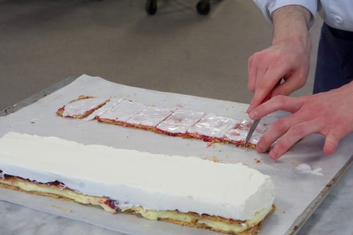8. Skär upp ”locket” i 55mm breda bitar och lägg varje bit ovanpå grädden.